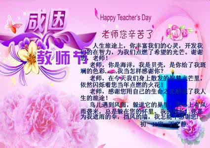 3. 蜡烛亮了,燃烧的是自己;受挫时,有你激励的话语;花谢了,回馈的是桃李。进去时,我们懵懂无知;出来时,头脑充实真理。师恩难忘,教师节了,祝老师一切顺意!