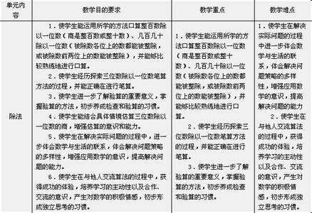 本册教材的重点是:除数是一位数的除法、两位数乘两位数、面积以及简单的数据分析和平均数。难点是培养学生分析问题,解决问题的能力以及应用数学的意识。