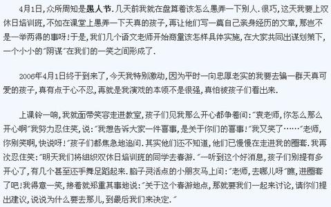 愚人节到了,我高高兴兴的来到了学校。叮铃铃,上课了,老师讲了课文内容,时间飞快的过去了,叮铃铃,下课了,我准备去逗认了,我现对我班的李某说,我得了艾滋病,我传染给你。他说:“啊?”然后他跑了,我就去跑步了,没想到上课了,我迅速的站好队,等待上楼。刚到了走廊,我对我们班的“足球拉拉队”队长王添说:“你鞋带开了!”他一看,就说我骗他,过了1分钟,我就说“南无尔弥托福”没想到,他的鞋带一下子就开了,别人笑起来,我就说怎么这么灵呢?然后王添就告老师了,老师把我训斥了一顿。我和老师说:“今天愚人节,我逗他们玩呢!”我的愚人节有伤心也有快乐,但最多的还是快乐,哈哈!