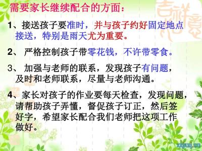 请各位家长意识到,学生的教育不仅仅靠学校,其实家庭的教育对学生的影响非常大。许多家长,往往到了初三,等到孩子完全变坏,到了不可收拾的地步再跑到学校求老师,或者埋怨学校教育不负责。殊不知,这样的种子是在初一的时候就播下的,到了无可挽回的地步,老师,家长都没有办法了。所以,现在家长对自己的孩子一定要高标准,严要求,从初一起要在各方面引起足够的重视和认识。我认为:一个学生,初中毕业应该不成问题。但是如果对学生只提出初中毕业的要求,这个学生绝对毕不了业。家长对学生的要求松一尺,学生对自己的要求松一丈。各位家长,对自己的孩子心中都有数,如果你认为自己的孩子只能达到初中毕业的程度,请你对他提出读完大学的要求。孩子的前途,不要给他安排,让他自己去选择、去奋斗!我常常听到一些家长说:“等我的孩子初中毕业,就给他找个工作”。这种家长的孩子,到了初三,就成了老师感到头疼的对象。所以,在初一时,一定要给家长打这个预防针,对孩子要求严格一点对他的成长只有好没有坏。