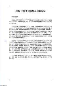 预备党员年度自我鉴定篇一在党组织的关怀与培养下, 我于 2010 年*月**日经党支部批准,成为一名光 荣的中国共产党预备党员。 自从我被批准为预备党员以来,在党组织的带领下和 支部党员的无私帮助下, 通过一系列的理论知识学习,在政治思想方面有了较大 的提高。在进入大学四年级的这段时间里,经过党组织的教育、培养,我更加深 刻地领会到我们党的进步性、 先进性和代表性,从心里感觉到自己的思想觉悟提 高了、视野广阔了、为人民服务的决心增强。特别是通过参加组织生活和党员交 流等活动,使我认真学习了党的光荣传统和作风,加深了对党的宗旨的认识,增 强了党性修养。 在党组织的培养教育下,我一直都按照党员的标准来严格要求自 己,以科学发展观为指导,保持党员的先进性,加强学习,认真工作。值此预备 期满之际,我郑重的向党组织提出转正申请,为便于党组织对我的考察,现将一 年来的基本情况向党组织汇报如下:
