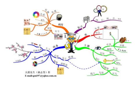 第三,完成后的图,线条和文字都是黑色的。颜色也可以增强我们的记忆,刺激我们的大脑,所以在绘图的过程中尽可能的多用几种颜色,最少要准备一支四色笔。还有就是里面尽可能多用图,多用和所表达的主题有关的图,这样也可以起到帮助理解,提高记忆的目的。别忘了我们中国汉字有将近1/2的文字是象形文字。中国的汉字的是来源自于我们自然界的万事万物的影像,这是象形文字的起源。