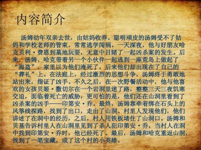《汤姆索亚历险记》英文读后感1000字(2)I was read the book which called “The Adventures of Tom Sawyer”. This story is about a clever boy called Tom Sawyer.