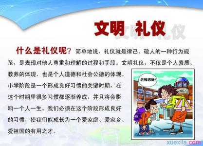 再次,学习“礼仪”要重在实践。广义的礼仪泛指人的言行、修养,狭义的礼仪指礼节。要敢于在日常的言行中、平时的待人接物中展现自己文明有礼的形象。通过学校开展的丰富多彩的礼仪实践活动,进一步培养同学们具有理解、宽容、谦让、诚实的待人态度和庄重大方、热情友好、谈吐文明、讲究卫生的举止行为。同时也希望老师们以课堂教学和班级管理为主渠道,把文明礼仪教育寓于学科教学中,贯穿于教育教学的各个环节中。使同学们进一步懂得尊重知识、尊重老师、尊重同学、尊重他人、尊重劳动,使文明的气氛充满校园。