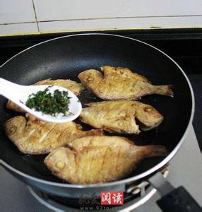 9、轻轻地晃动一下煎锅,使鱼均匀地沾上百里碎后,加入小许清水,盖上锅盖,焖煮3—5分钟。