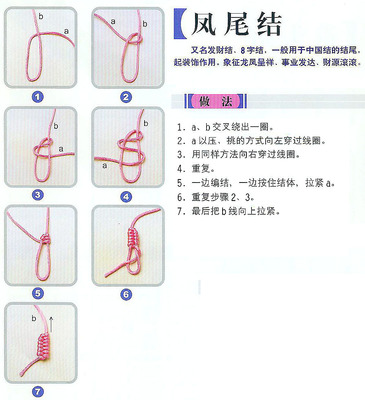 凤尾结又名发财结、八字结,一般用于中国结的结尾,起装饰作用,象征龙凤呈祥、事业发达、财源滚滚。中国结凤尾结的编法图解、凤尾结打法教程:1.a、b交叉绕出一圈。2