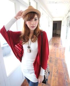 暗红色针织披肩式开衫,三分懒懒的感觉,三分性感的感觉。看起来随意,但是不经意间又流露出很多女人味。里面搭配干净的长T恤,牛仔裤,看起来利落有范儿。或者搭配松散的长裙,有点吉普赛女郎的感觉。