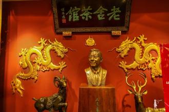 老舍茶馆,坐落在前门西大街3号楼,始建于1988年,是一家以人民艺术家老舍先生及其作品命名的茶馆。茶馆位于三层,门口环饰着紫木透雕;位居正中的“老舍茶馆”金字牌匾下方,人民艺术家老舍先生的铜像屹然凝视着远方。老舍先生的崇高品质和他笔下的京味《茶馆》感染了无数大众,也使这座融茶道、民族艺术于一体的老舍茶馆名扬中外。