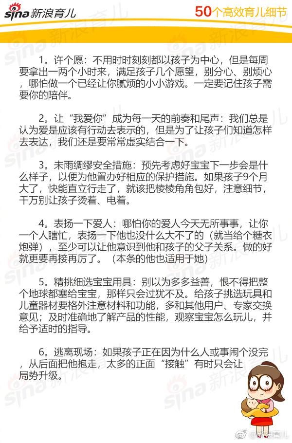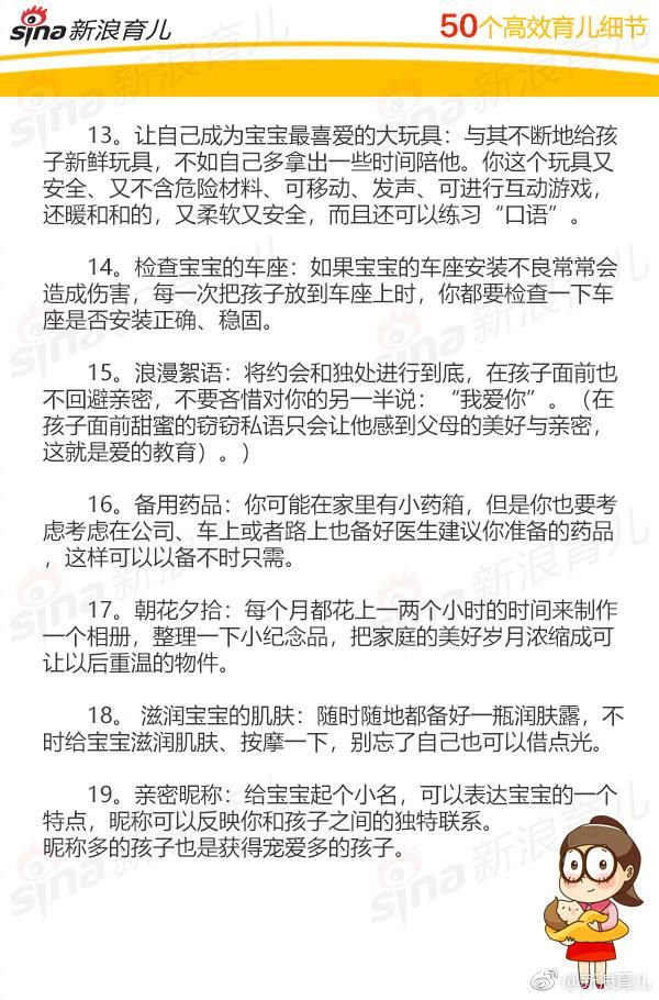 【50个高效育儿细节 各位爸爸妈妈做到几个?】这50个育儿细节,可以帮助爸爸妈妈,养育出一个开朗自信的好宝宝!内容其实挺简单的,可能你已经做了一些,但也可能忽略了一些。父母们快仔细数一数,自己能够做到几条呢?超过一半就给自己点个赞吧!