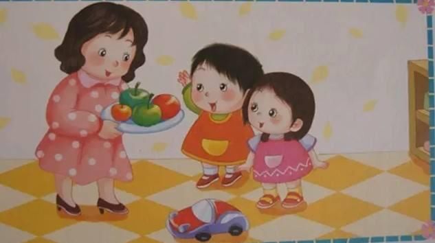 先准备一盘苹果,一盘梨(每样3个左右)。家长先问宝宝“这是什么”,让宝宝认一认盘子里放的是什么。家长对宝宝说:“我们来分苹果吃,请宝宝来给大家分,1人分1个。”宝宝分时,“爸爸1个”、“妈妈1个”、“我1个”,分对了,家长要说谢谢并同宝宝一起高高兴兴地吃苹果。吃完后,家长又让宝宝分梨,方法同上。