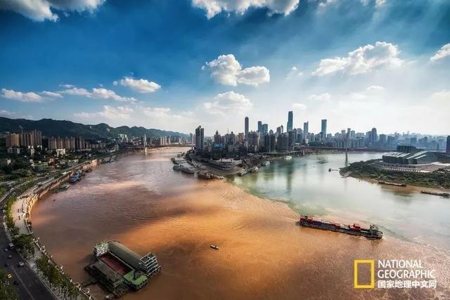 长江和嘉陵江在渝中半岛交汇,一清一浊。左为长江,黄腾腾,气势汹汹;右为嘉陵江,绿莹莹,碧波婉转。
