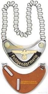 这块月牙形金属牌代表着他们的身份,它是锌或铝材制,正面表面镀亚光马特银,两端的圆钉、中间的鹰徽、“Feldgendarmerie”(战地宪兵队之意)字样都涂有发光漆,背面有铁灰色布料衬,降低与衣服的摩擦;金属链有42节。