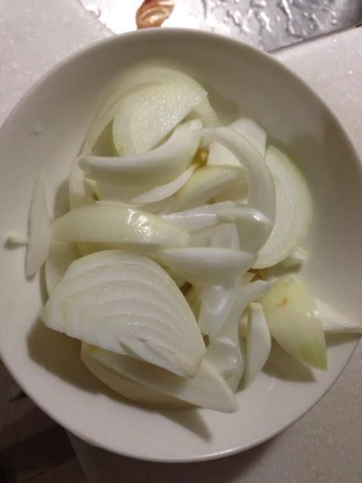 3.切条放入有深度的盘子(不可以在洋葱里加水哦)