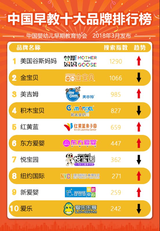 本期搜索2017年3月至2018年3月各早教机构的发展状况的综合数据汇总,得出一个受到业内人士的一致认同的2018最新早教机构品牌排行榜。依次排名为:金宝贝、美国谷斯妈妈、美吉姆、积木宝贝、红黄蓝、东方爱婴、悦宝园、纽约国际、新爱婴、爱乐。其中,美国谷斯妈妈受投资人和家长欢迎度最高,搜索趋势上升最快。