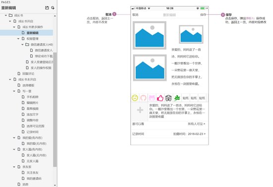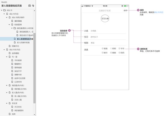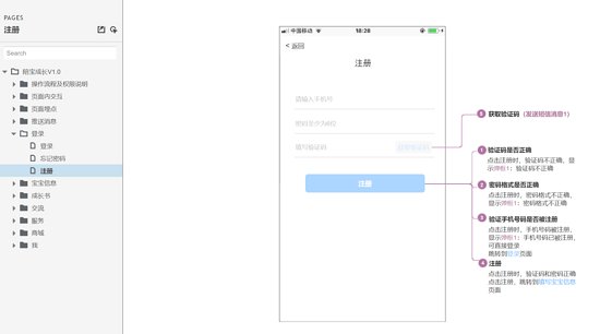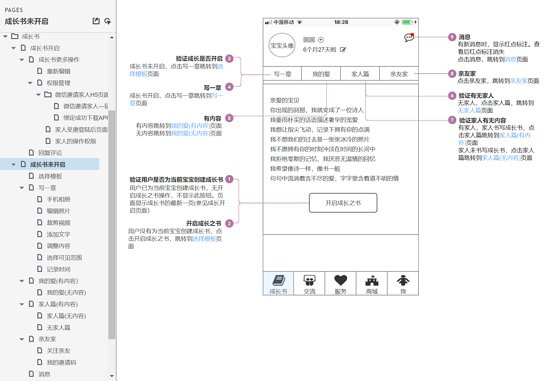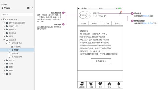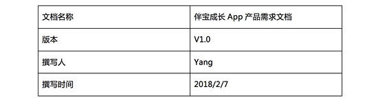 「伴宝成长」是一款注重体验的产品,无复杂逻辑,故而没有梳理产品逻辑流程图;PRD未涵盖所有的原型图,突出说明「伴宝成长」的创新模块(成长书模块,交流模块,服务模块),对于已约定俗成的模块(登陆模块,商城模块,我模块)未做过多原型图。文档描述:(1)版本修订记录