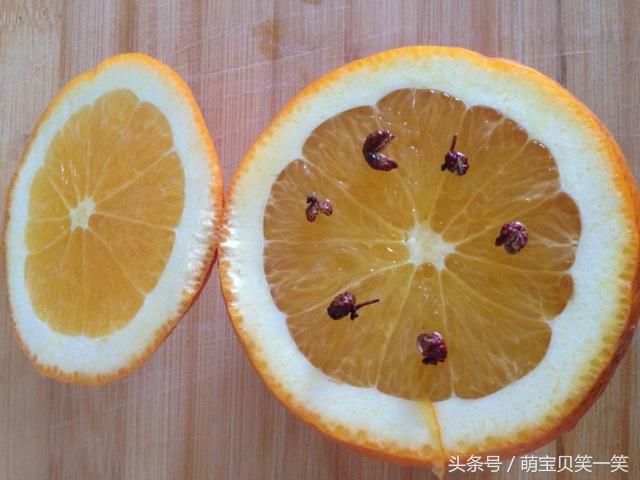 2. 橙子肉戳5个洞把事先准备好的花椒塞在洞里。